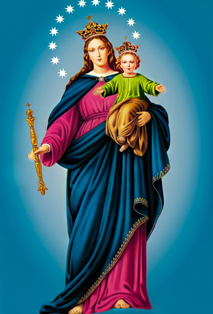 The BIBLE symbolizes the Word of God, the assiduous meditation of which will nourish the mind of the Missionary Sister, strengthen her will, and form her heart to preach this WORD to the world. The ‘M’ with CROWN AND SCEPTRE represents Mary Help of Christians, the Principal Patroness of the Congregation. She is the special Protectress and the inspiration of the Missionary Sisters, their model and guide in their religious life and in their apostolate. The CROSS stands for Christ, who is the center of our lives, from whom we draw light and strength to carry out our apostolate. It also reminds the Missionary Sister of the crosses she must be ready to embrace in her apostolate as proofs of her love for Christ and efficacious means of saving souls. The WORLD symbolizes the field of the Missionary Sister’s apostolate, where she proclaims the Good News of Christ in order to draw all people to Him. The STAR represents Our Lady, ‘the Star of Evangelization’, to whose care the religious life and missionary activities of the Missionary Sister are entrusted.
